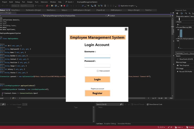 I made this Employee management system using c# and SQL and it allows us to keep track of our employee.This project took me around 1 week to make and it uses SQL servers to store and fetch data efficiently