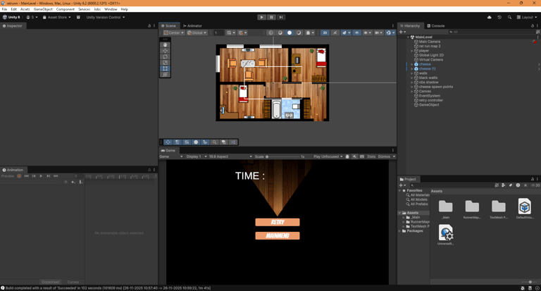 This is a 2D top down game where you play as a rat sniffing out cheese in the dark.We made this for a game jam hosted by our college.In this project I learned about 2D lighting and quick prototyping.This is an endless runner type game so people fight to set the highest score possible