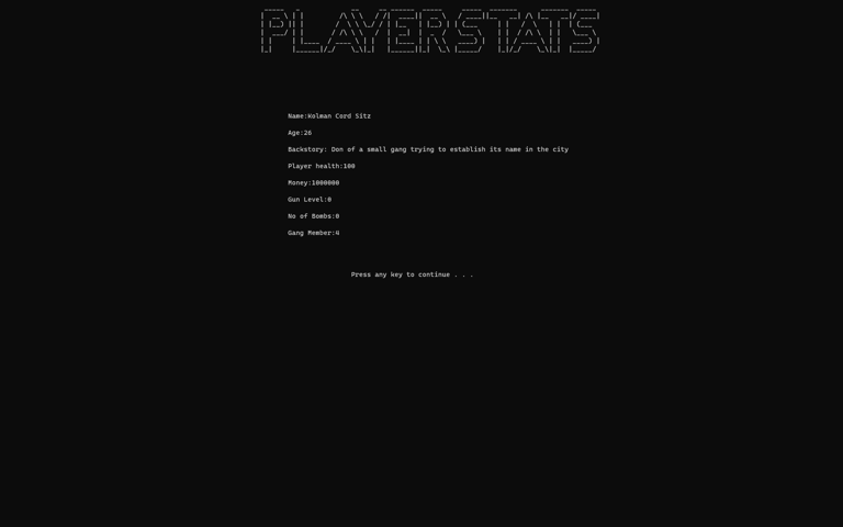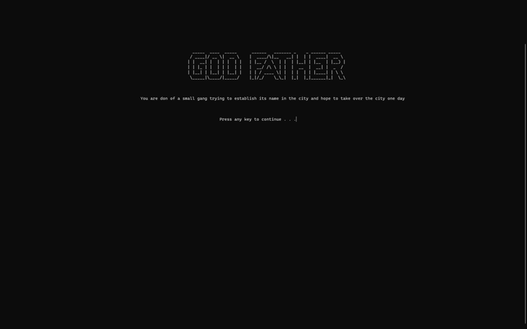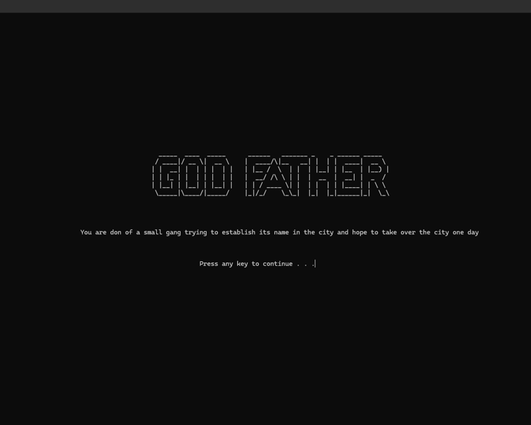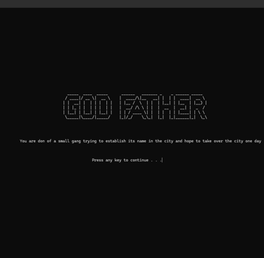 Developing The God Father was an exciting journey that pushed me both as a programmer and as a storyteller. What started as a simple plan to build a text-based RPG in C# slowly grew into a complete narrative experience filled with choices, upgrades, gang management, and a full revenge-driven storyline.